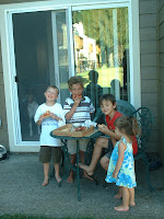 Here are Braiden and some of his friends having some fun on a hot day. Water gun fights, pizza and Popsicles. All this while Susie waits patiently.Mom finally got a job. Yeah!! We close on the house on the 24th. ---It's all falling together!---Hugs and kisses.